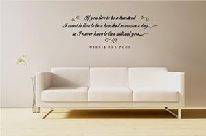 Product Description : One If You Live To Be A Hundred - Winnie The Pooh Quote Vinyl Wall Decal measuring roughly 18" x 45" Manufactured and Marketed Exclusively from The Custom Vinyl Shop. The Custom Vinyl Shop prides ourselves on lightning fast shipment times, we always will ship your decal within 2 days of purchase. We offer over 30 stock colors in both matte and shiny finish (please reference our color chart above). Please message us after your purchase to specify your vinyl color choice. The Custom Vinyl Shop's vinyl lettering and wall decals are made from the best vinyl on the market, and will last a very long time in your home. All colors are Matte finished for a custom hand painted look, Shiny vinyl is also available upon request. Decorate your home with beautiful and affordable vinyl lettering wall phrases, vinyl art, and words for your walls. It is the newest home decor trend. It's easy to apply and really makes a room look elegant. Words evoke emotions that pictures cannot. The Custom Vinyl Shop Lettering phrases or art will arrive in 1-2 pieces for easy application. Applying our vinyl is like putting a large sticker on your wall and having it look like stenciling, without the work. Thank you for looking!